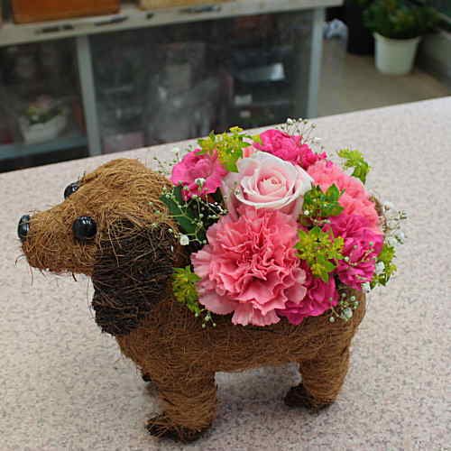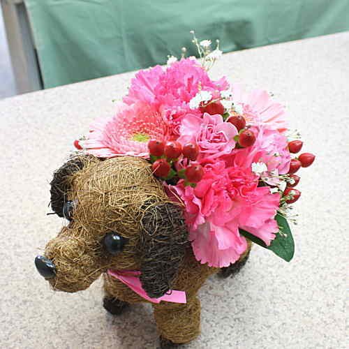 ワンちゃんバスケットの器は、フラワーアレンジメントが枯れた後も、可愛く活躍しますよ。