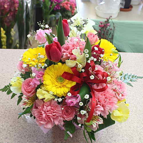 - 生花アレンジメントの器は籐かごなどになります。手軽にそのまま飾れて、とても華やかです。