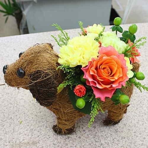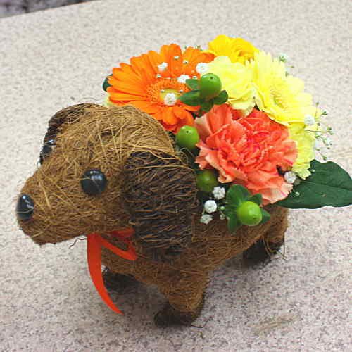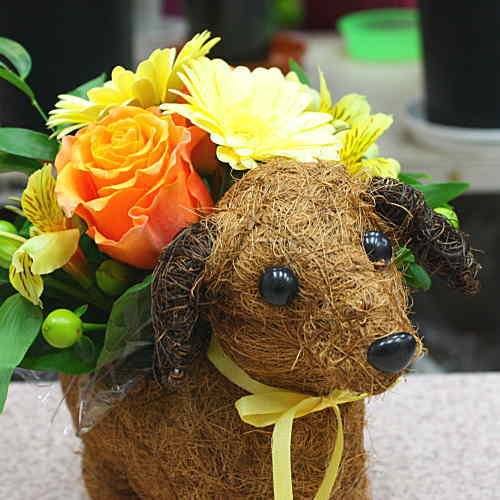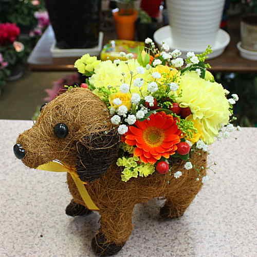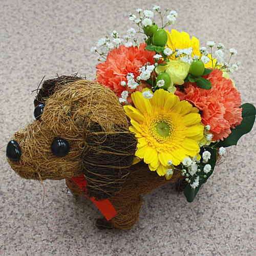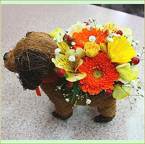 - 12時までのご注文は即日発送致します。可愛い犬のバスケットに季節のお花、黄色オレンジ系でアレンジします。お送りした商品画像を見ることができます。「誕生日」「お祝い」「お見舞い」「ギフト」などプレゼント・贈り物にオススメです。