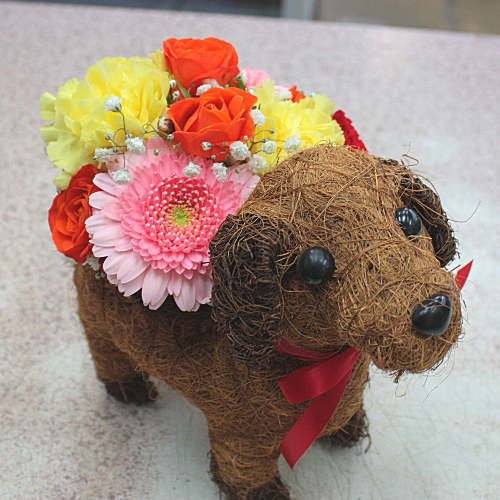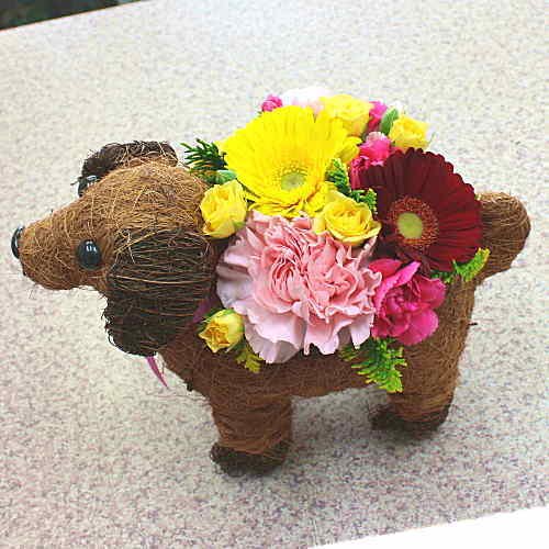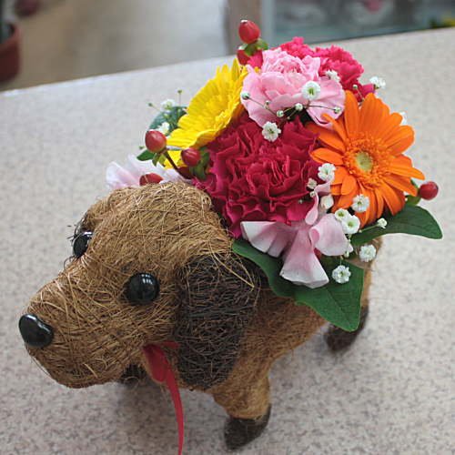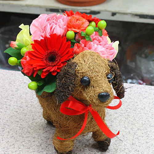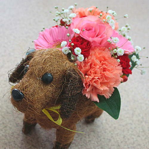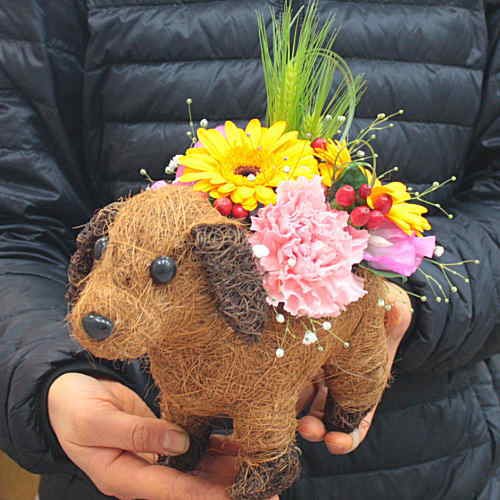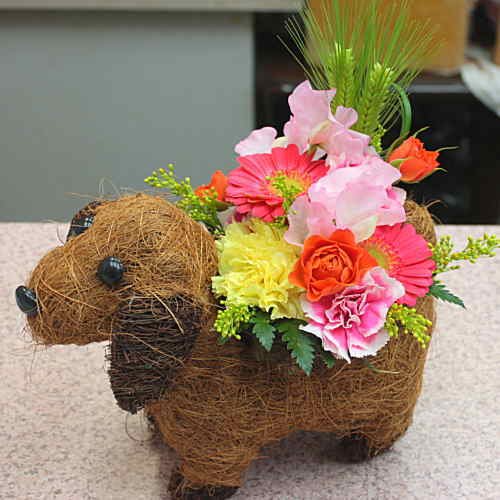 ワンちゃんバスケットの器は、フラワーアレンジメントが枯れた後も、可愛く活躍しますよ。