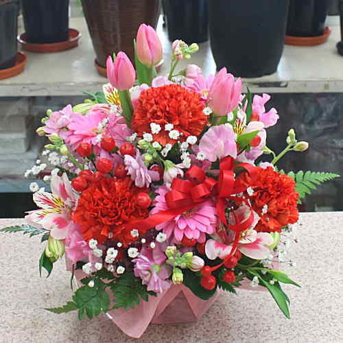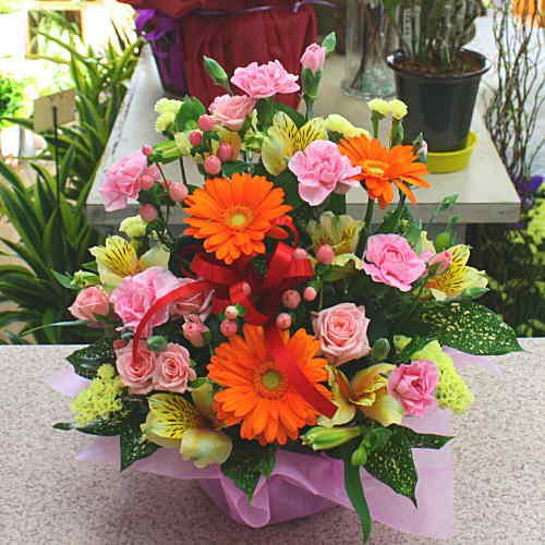 - 季節の花、ガーベラやカーネーションなどを主に季節の花を可愛くカラフルにアレンジメントします。