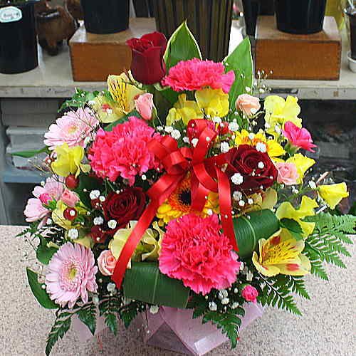 お祝いや誕生日に華やかなカラフル系のフラワーアレンジメント(生花)気持ちをお花に託してプレゼント