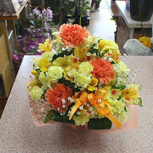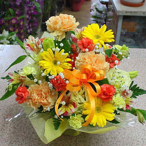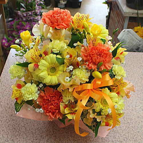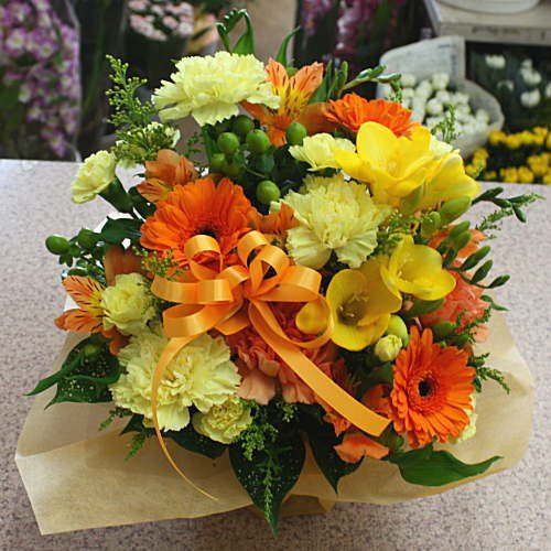 - 12時までのご注文は即日発送致します。パッと華やかな黄色オレンジ系の花、ガーベラ、カーネーションなど可愛いアレンジメント。手軽にそのまま飾れて、とても華やかです。