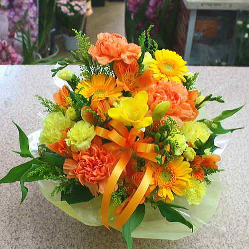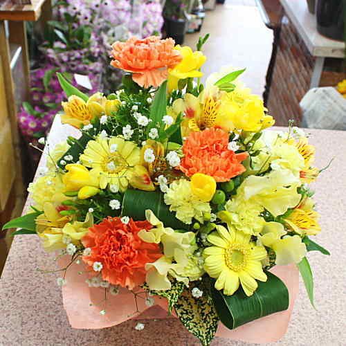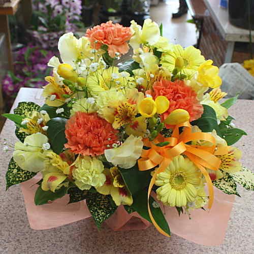 季節の花の黄色オレンジ系生花アレンジメントフラワー 誕生日・記念日・開店・開業・発表会などのお祝いプレゼントに