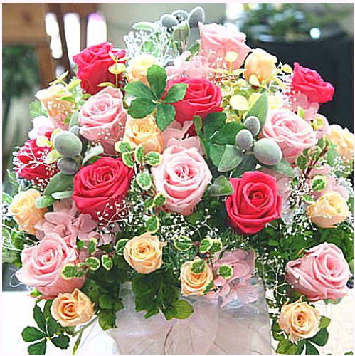 - バラとかすみ草のプリザーブドフラワーアレンジメント。 バラの花を20輪使用し、優しくかすみ草を入れています。