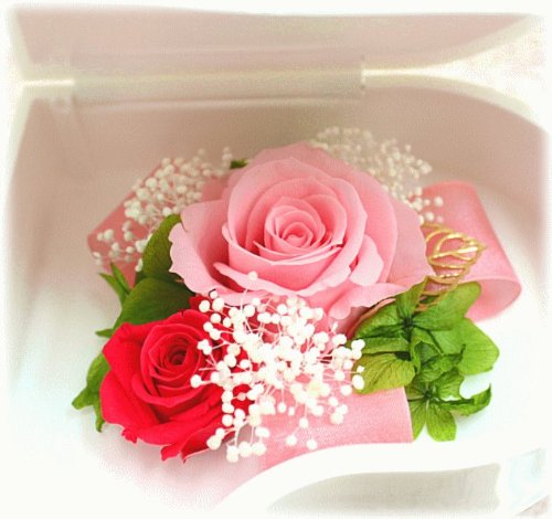 - プリザーブドフラワーは造花とは違い、生花に特殊な加工を施し柔らかな質感、鮮やかな色合い・雰囲気を長い間お楽しみいただけるように加工した枯れないお花です。
