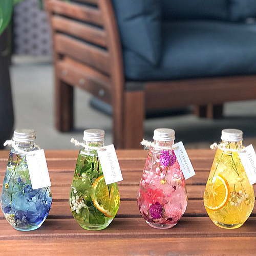 - ハーバリウムはそのままお部屋に飾ってもおしゃれですが、陽の光に照らすと、より一層その美しさが際立ちます。お手入れいらずで、3ヶ月から1年ほど植物が美しいまま保存されます。瓶の蓋を開けると液体がこぼれますので不要になるまでは開けないで下さい。