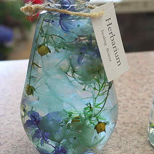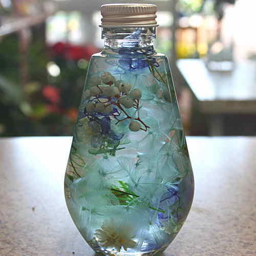 - 光のある場所に飾られると瓶の中に閉じ込められた花がキラキラとしていて、とてもキレイなインテリアグッズとなります。植物はあじさい・かすみ草・レモン・ペッパーベリーなどを使用しています。