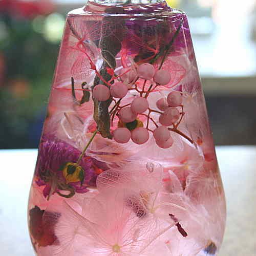 - 光のある場所に飾られると瓶の中に閉じ込められた花がキラキラとしていて、とてもキレイなインテリアグッズとなります。植物はあじさい・かすみ草・レモン・ペッパーベリーなどを使用しています。