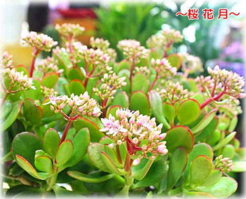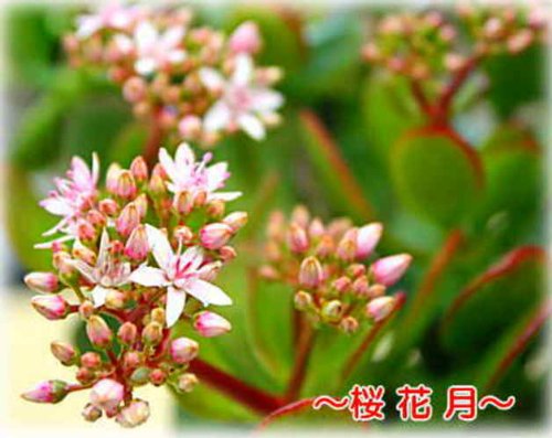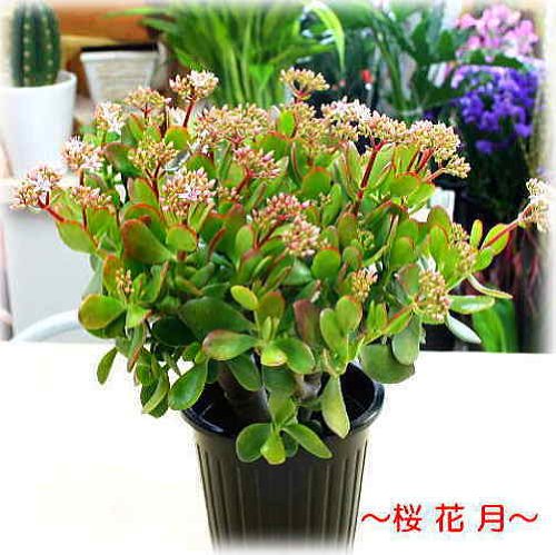 - 【品種】金のなる木「桜花月」成金草 花付き 5号プラスチック鉢植え 【サイズ】高さ約40cm:幅約30cm 植物の為、写真と若干開花状態・形状などが異なる場合がございますのでご了承ください。【備考】育て方の説明書付き