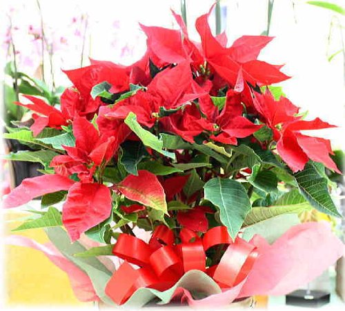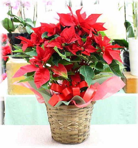 - 12時迄のご注文は即日発送致します。ボリュームたっぷり大きなポインセチア鉢植え 5号鉢植えかご付(かごの色はおまかせになります) お洒落なクリスマスを・・・