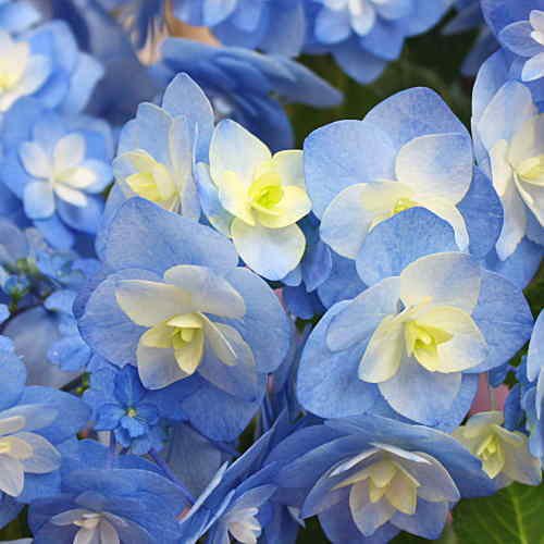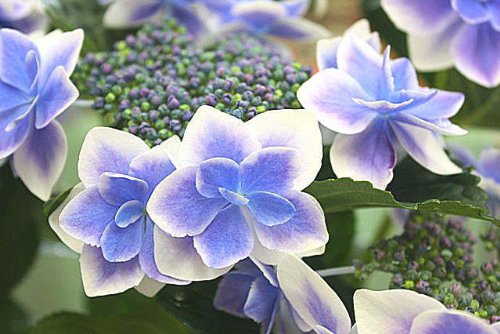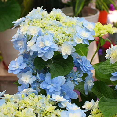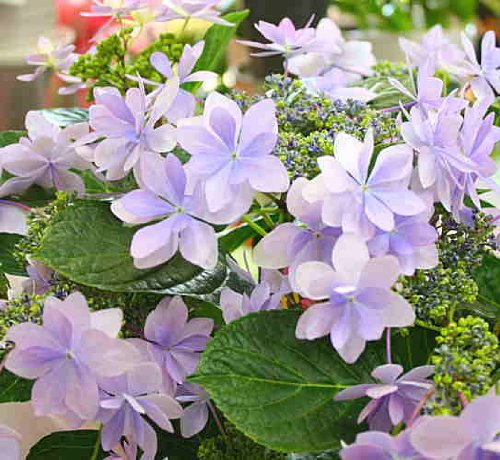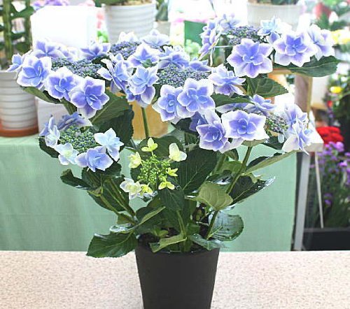 ブルー・紫系あじさい「額」は、花が円を描くようにまわりに咲くあじさいです。プレゼントには人気の品種が増えました。