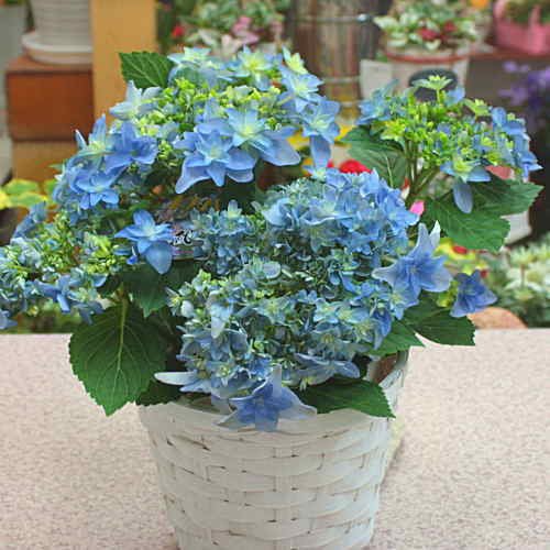 - 12時までのご注文は即日発送致します。。花鉢プレゼントはにあじさい鉢植え ブルー・紫系額系 5号鉢植えかご付 品種はおまかせとなります。