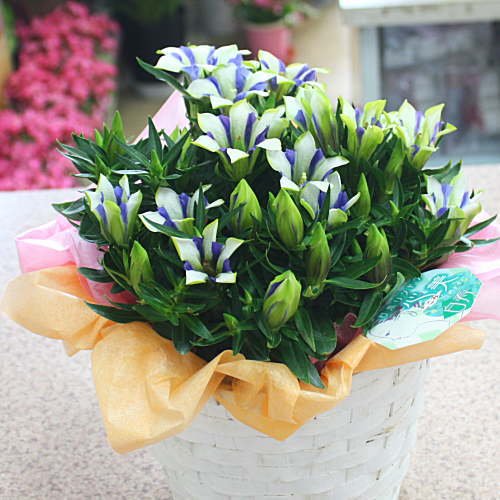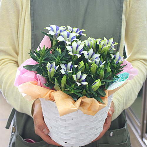 - 【品種】りんどう白寿 4.5号鉢植え 籐かご付き(かごデザイン・色はおまかせとなります)