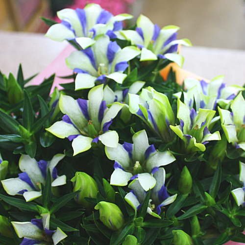 ※福岡県甘木地方産りんどう風車のような白とブルーのコントラストが美しい鉢植え「心美・白寿」大輪系のしっかりと開くタイプ