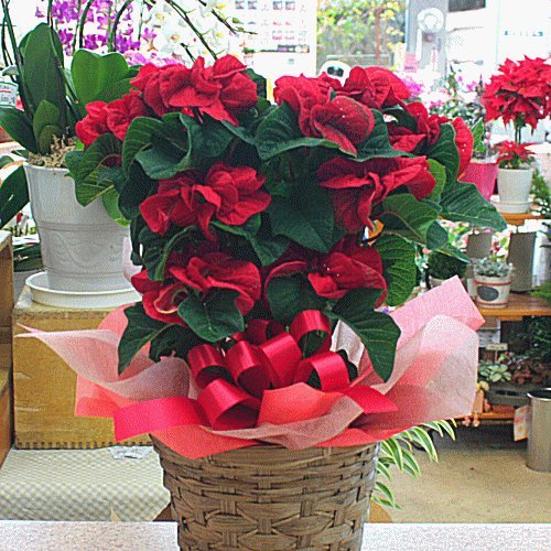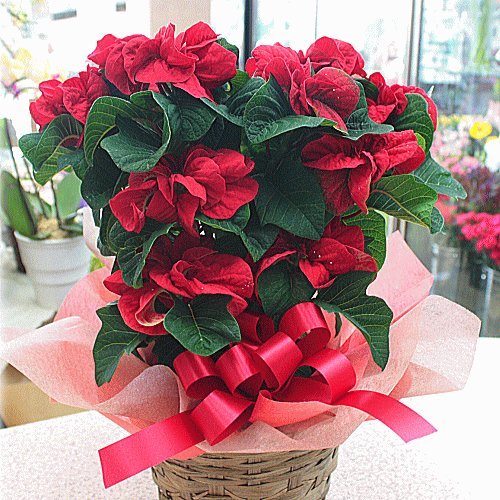 真っ赤なポインセチア「ウィンターローズ」5号鉢植えかご付 クリスマスフラワー お届け日時指定できます。