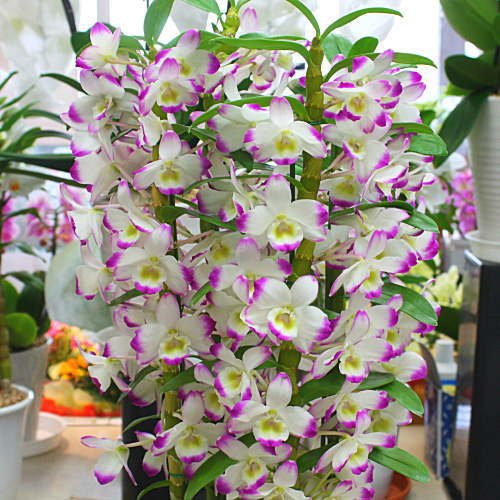 花色は様々でカラフルなかわいい蘭の花がぎっしりと咲く デンドロビューム鉢植え