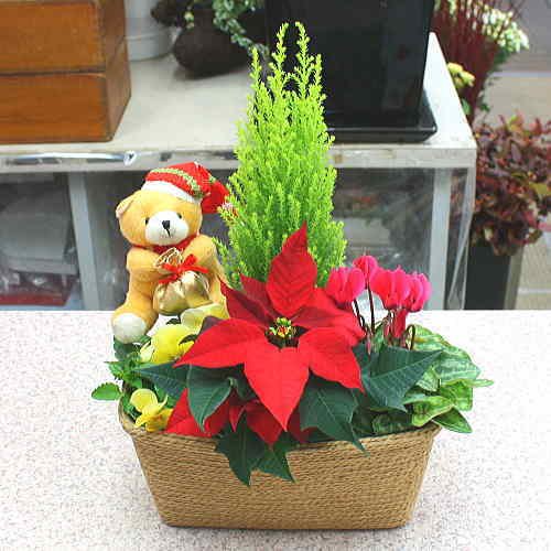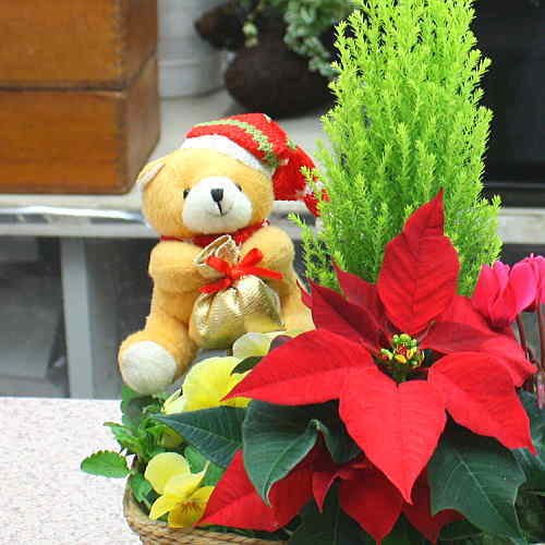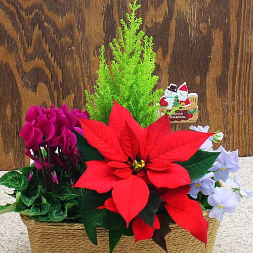 - クリスマスを感じさせる花鉢 ゴールドクレスト・シクラメン・ポインセチア・ビオラをバスケットにつめています。