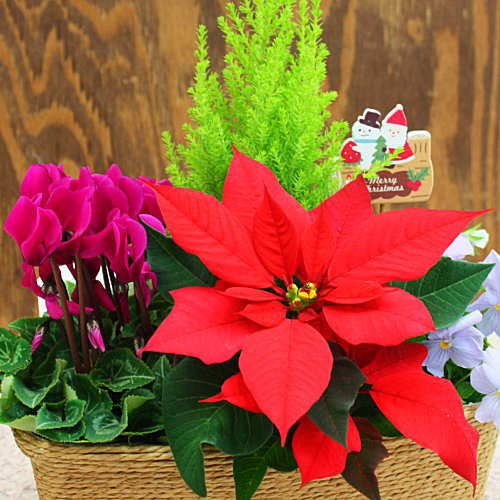 クリスマスを感じさせる花の寄せ鉢 赤いポインセチアとゴールドクレスト・シクラメンの鉢植えをバスケットにアレンジ お祝い 誕生日