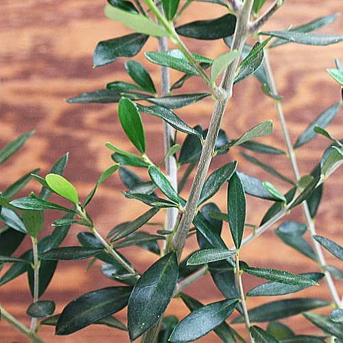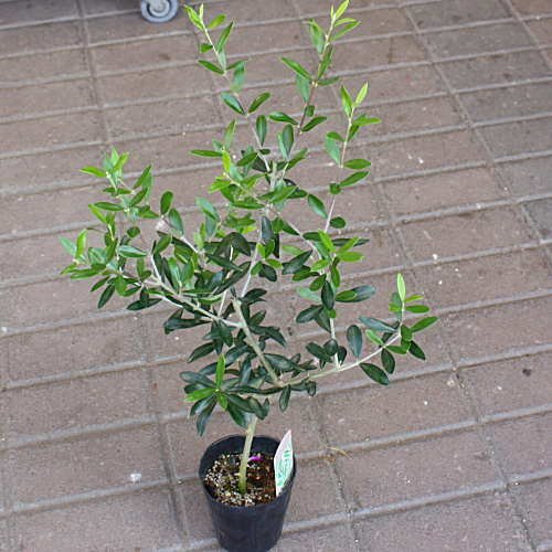 - ギリシャ産品種のオリーブは、自然にまとまる円錐形のクリスマスツリーのような樹形、葉の形は他品種と比べてシュッとした細い葉に先がやや尖った銀葉系です。