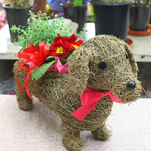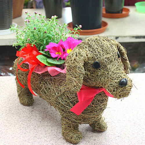 犬のダックスと季節の花鉢 (ヘリクリサムとポリアン)寄せ鉢ギフト 誕生日やお祝いに花のプレゼント