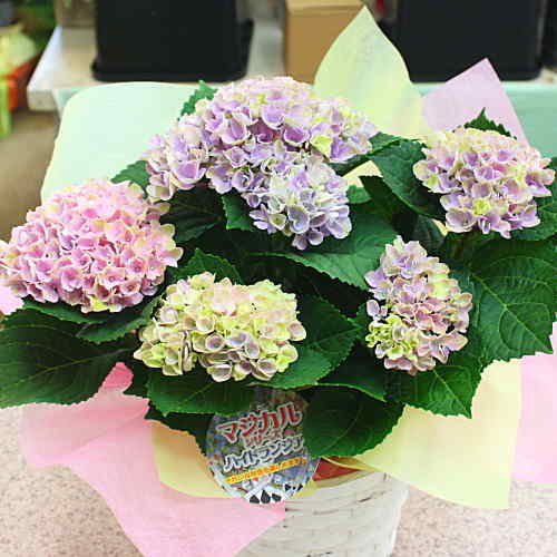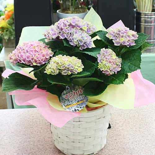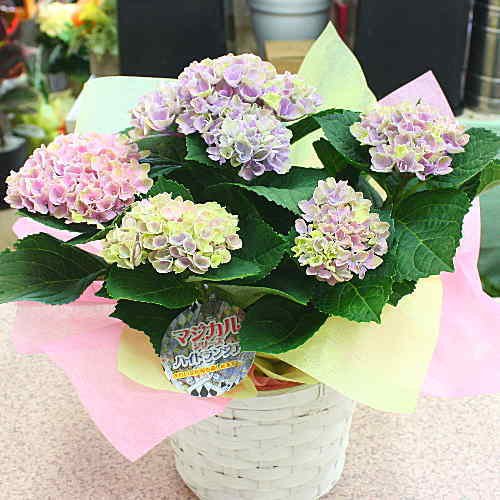 - アジサイ鉢植え 色の変わるあじさい ピンクパープル色 5号鉢植え 籐かご付 「マジカルレボリューション」 花色が変わるユニークなあじさい。小さめの花でコンパクトで可愛い感じでピンク色に紫色などの花が咲きとっても綺麗です。色の変化をお楽しみ下さい。