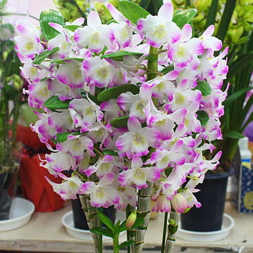 花色は様々でカラフルなかわいい蘭の花がぎっしりと咲く デンドロビューム陶器鉢植え