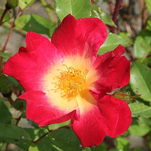 - 花芯の明るい黄色~花びらは鮮明な赤、一重咲きの色鮮やかなバラです。