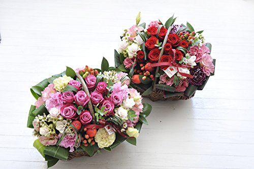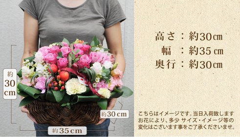 バラのガーデンバスケットアレンジメント まるで童話からとびだしてきた夢いっぱいの花かご。 ナチュラルな雰囲気の中に華やかさがあり、 御祝いのシーンに大変喜ばれます。 お庭をそのまま切り取ったような自然的で ぬくもりのあるアレンジメントです。
