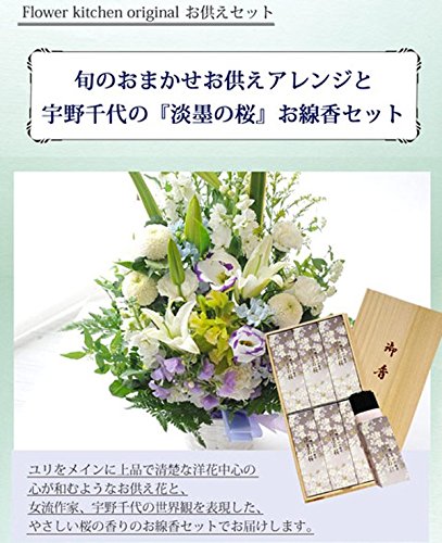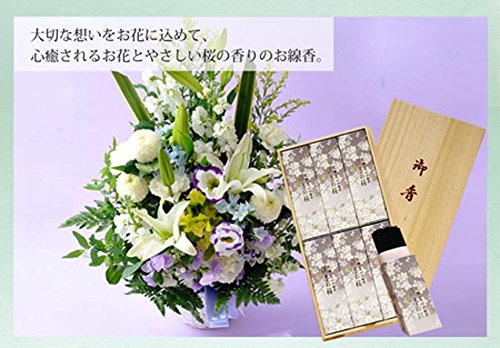 【お供え花&お線香セット】 洋花の旬のおまかせ供花 「宇野千代のお線香 淡墨の桜(うすずみのさら)」 メーカー:日本香堂 香り:桜の香り 成分:タブ粉、香料 内容量:1サック(約60g) ×6個入り 線香の長さ:約14センチ