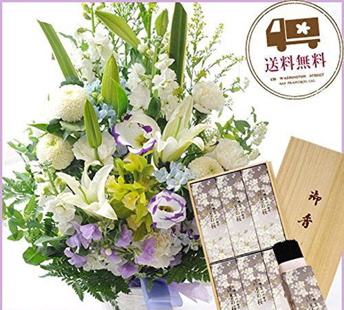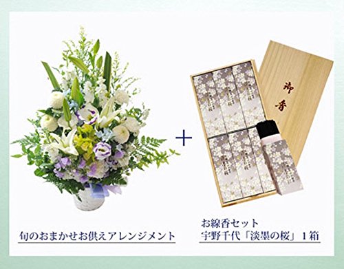 お供え 旬のおまかせ供花(白に青紫カラー)と+桐箱入り「淡墨の桜」線香セット