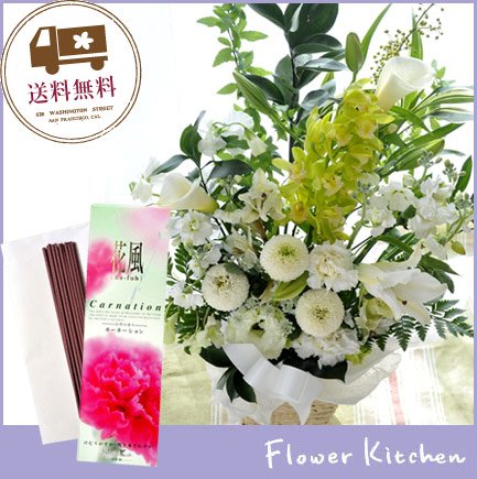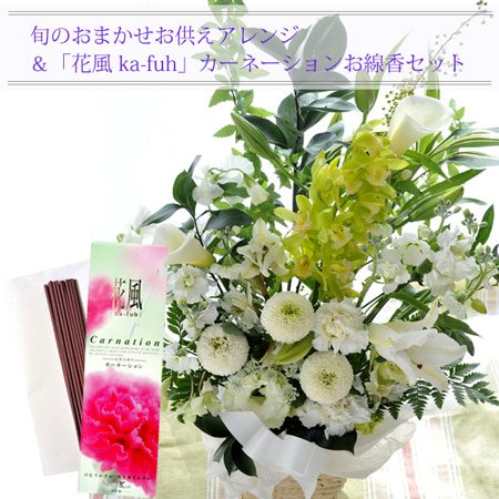 お供え線香セット お供えアレンジ8400円 カラーは白のみ(グリーンが入ります) +線香 花風カーネーション