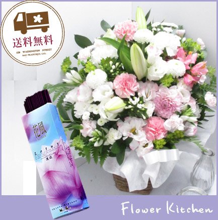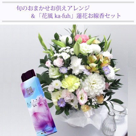 【お供え花&お線香セット】 洋花の旬のおまかせ供花 お花のカラーはおまかせミックス淡い色合い 【線香内容】 内容量:約60g(1サック20本入) 線香サイズ:約14cm 燃焼時間:約25分 日本香堂のお線香「花風 ka-fuh 蓮花」 蓮花の可憐で透明感のあるフローラルで清楚な香り。 微煙タイプのお線香です。