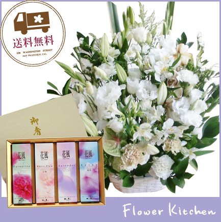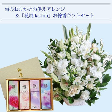 お供え線香セット 供花アレンジ10500円 カラーは白のみ(グリーンが入ります) +線香 花風4種セット