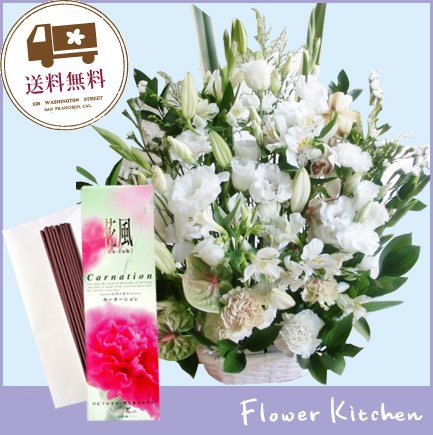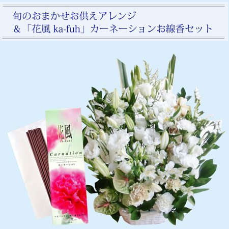 お供え線香セット 供花アレンジ10500円 カラーは白のみ(グリーンが入ります) +線香 花風カーネーション