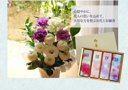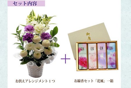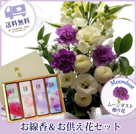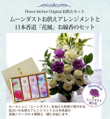 【お供え花&お線香セット】 ムーンダストのお供えアレンジMサイズ ) 【線香内容】 日本香堂の「花風ka-fuh-」お線香ギフトセット 【カーネーション・白梅・ラベンダー・蓮花】の4種類の香りが楽しめます。 微煙タイプのお線香です。化粧箱に入れてお届けします。 ■1サック(約60g)×4個入り 線香の長さ:約14cm