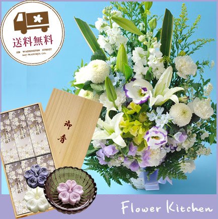 お供え線香セット 供花アレンジ5400円 カラーは白に青紫を入れて +淡墨の桜 桐箱 お線香・浮きローソクセット