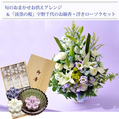 【お供え花 お線香 ローソク セット】 洋花の旬のおまかせ供花 お花カラーは白に青紫を入れて 【お線香・淡墨の桜 桐箱に入れてお届けします】 「宇野千代のお線香 淡墨の桜(うすずみのさら)」 メーカー:日本香堂 香り:桜の香り 成分:タブ粉、香料 内容量:1サック(約60g) ×3個入り 線香の長さ:約14センチ 【浮きローソク】 香り:無香 燃焼時間:約1時間 内容量:3個入り(ガラスの容器1個入り)
