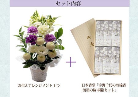 お供え線香セット ムーンダストお供えアレンジMサイズ+桐箱入り薄墨の桜線香セット