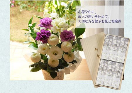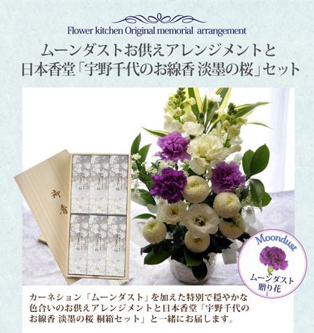 【お供え花&お線香セット】 洋花の旬のおまかせ供花 ムーンダストお供えアレンジMサイズ 【お線香】 「宇野千代のお線香 淡墨の桜(うすずみのさら)」 メーカー:日本香堂 香り:桜の香り 成分:タブ粉、香料 内容量:1サック(約60g) ×6個入り 線香の長さ:約14センチ
