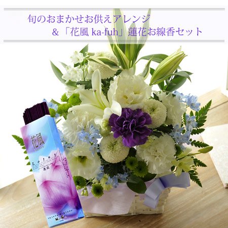 【お供え花&お線香セット】 洋花の旬のおまかせユリの供花 お花のカラーは白に青紫を入れて 【線香内容】 内容量:約60g(1サック20本入) 線香サイズ:約14cm 燃焼時間:約25分 日本香堂のお線香「花風 ka-fuh 蓮花」 蓮花の可憐で透明感のあるフローラルで清楚な香り。 微煙タイプのお線香です。