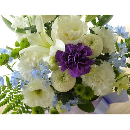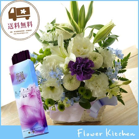 お供え線香セット ユリ供花アレンジ カラー 白に青紫を入れて +線香 花風ロータス蓮花