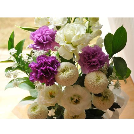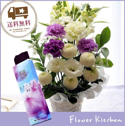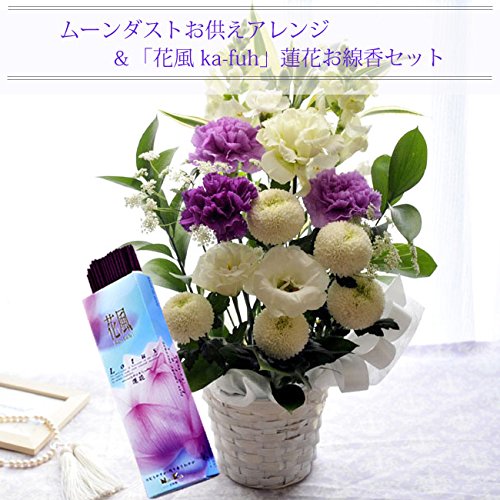 【お供え花&お線香セット】 ムーンダストM供花アレンジ 【線香内容】 内容量:約60g(1サック20本入) 線香サイズ:約14cm 燃焼時間:約25分 日本香堂のお線香「花風 ka-fuh 蓮花」 蓮花の可憐で透明感のあるフローラルで清楚な香り。 微煙タイプのお線香です。