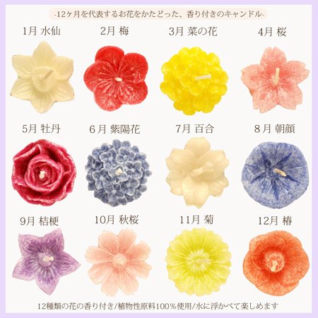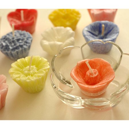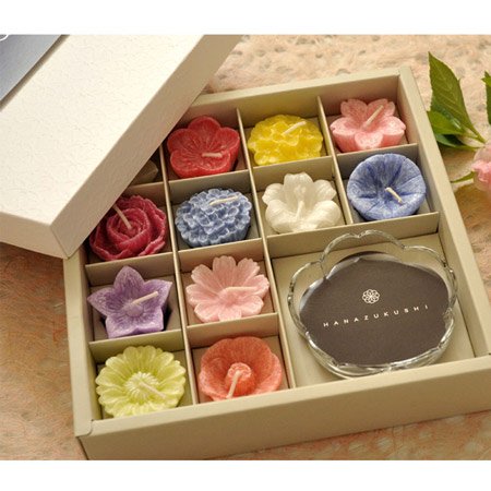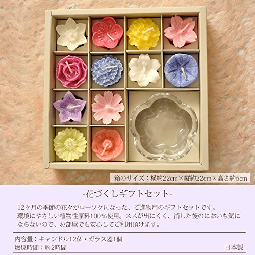- 内容量…キャンドル12個(それぞれの花の香りつき)/ガラスの器1個