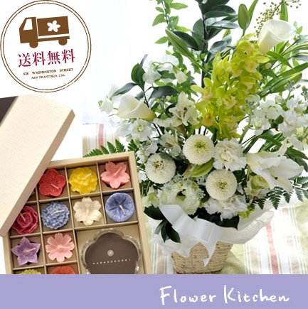 お供えセット 旬のおまかせ お供えアレンジ8400円 カラーは白のみ(グリーンが入ります)+【花づくし】12個のお花のキャンドルギフトセット