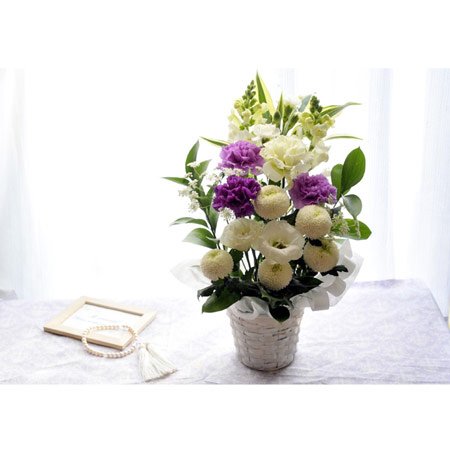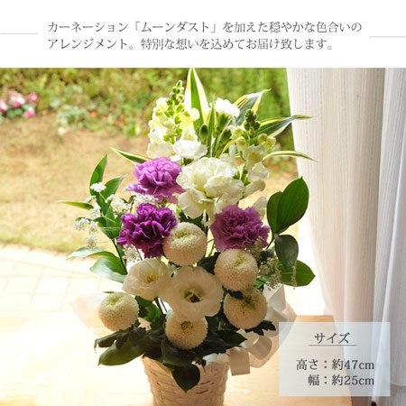 【お供え花 お線香 ローソク セット】 お花はムーンダスト供花アレンジMサイズ 【お線香・淡墨の桜 桐箱に入れてお届けします】 「宇野千代のお線香 淡墨の桜(うすずみのさら)」 メーカー:日本香堂 香り:桜の香り 成分:タブ粉、香料 内容量:1サック(約60g) ×3個入り 線香の長さ:約14センチ 【浮きローソク】 香り:無香 燃焼時間:約1時間 内容量:3個入り(ガラスの容器1個入り)