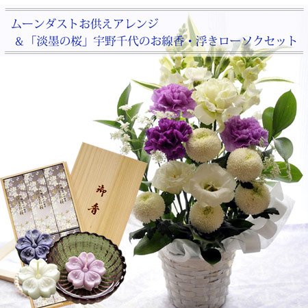 お供え線香セット ムーンダスト供花アレンジMサイズ+淡墨の桜お線香・浮きローソクセット