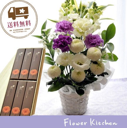 お供え線香セット ムーンダスト供花アレンジMサイズ +【東北復興支援線香】花は咲くフローラルの香りのお線香