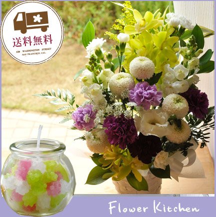 【お供え花&キャンドルセット】ムーンダストお供えアレンジLサイズ+「こんぺいとうキャンドル」スイーツキャンドル ギフトセット