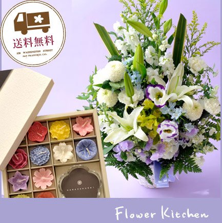 お供えセット 旬のおまかせお供えアレンジ5400円 カラーは白に青紫を入れて+【花づくし】12個のお花のキャンドルギフトセット